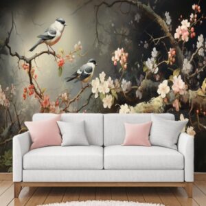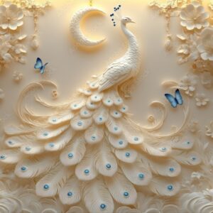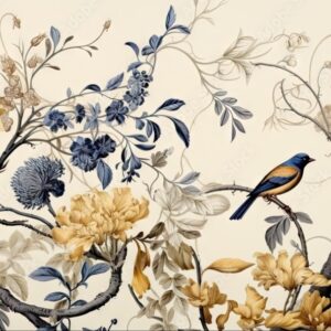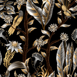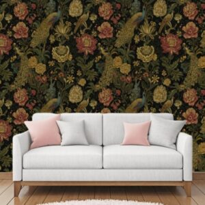 Dark background adorned with vibrant floral and peacock motifs, intricate details, repeating pattern, elegant style