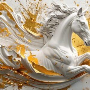 Golden Horse Splash Art Abstract Fluid Motion Dynamic Sculpture. Mural, wallpaper and background gold horse.