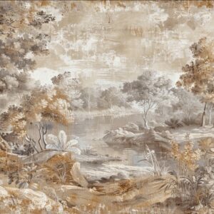 Tapestry-style Baroque wallpaper with pastoral life scenes in rich earth tones and gold accents for a rustic timeless look