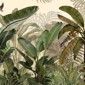 Tropical plants wallpaper design, Jungle background, big leaf and bird, back yard, landscape, mural art. AD 525937857