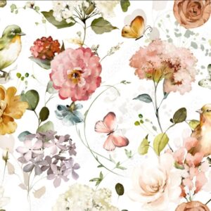 seamless floral watercolor pattern with garden pink flowers roses, leaves, birds, butterfly, branches. Botanic tile, background. AD 496317279