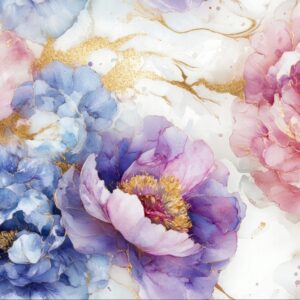 Vibrant watercolor flowers in pink, blue, and purple tones with golden accents on a white background, elegant floral decoration concept