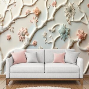 Decorative Floral Wall Art with Pink and Blue Flowers and White Branches in Soft Pastel Tones