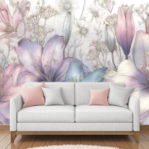 Elegant lily and wildflower background in pastel purple and pink tones. Dreamy watercolor pattern. Immerse yourself in timeless beauty with the delicate Floral Toile De Jouy Seamless Pattern.