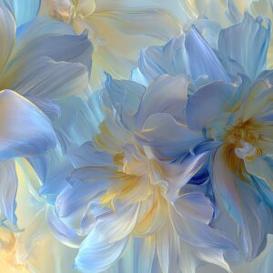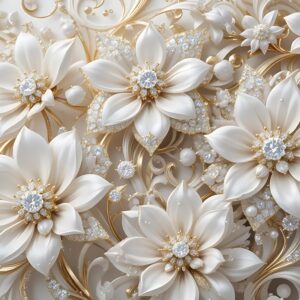 Elegant white flowers with gold accents and crystal embellishments in luxurious 3D style