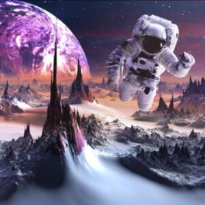 hand-painted space planet cartoon astronaut rocket children's room background wall 34199579