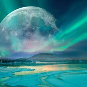 Northern lights (Aurora borealis) in the sky with super full moon - Tromso, Norway "Elements of this image furnished by NASA