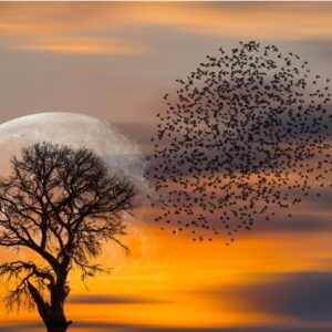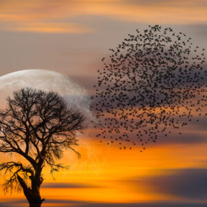 Silhouette of birds with lone tree in the background big full moon at amazing sunset