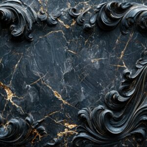 Intricate dark marble background adorned with elegant black gold leaf baroque style carvings.