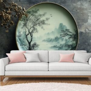 A beautiful decorative plate showcasing intricate landscape art with trees and mountains in soft colors