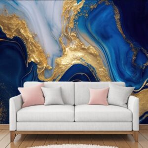Abstract pink and blue marble liquid texture with gold splashes, luxury background