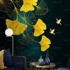 Modern light luxury gold relief line ginkgo leaf bird Nordic background wall wallpaper 23137698
