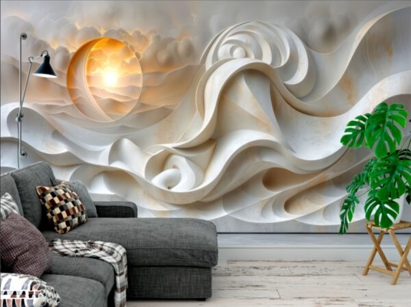 3D relief mural wallpaper featuring abstract representations of a desert landscape with textured sand dunes and sparse vegetation
