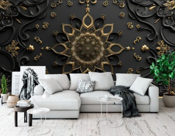3D wallpaper design for a ceiling featuring a black and golden mandala decoration model against a decorative frame