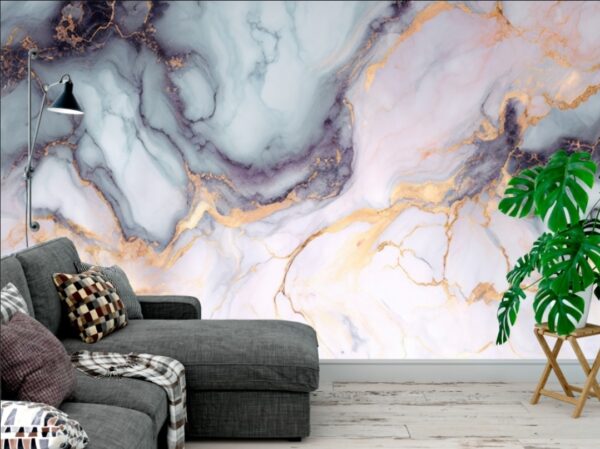 Abstract pink and blue marble liquid texture with gold splashes, luxury background