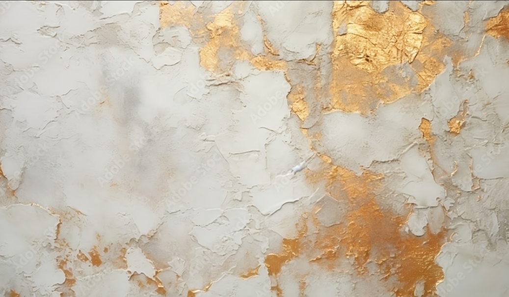 Art acrylic smear blot painting wall. White and golden abstract messy wall stucco texture background. Yellow lined decorative wall paint. White, gray and gold color canvas texture. AD 802929753