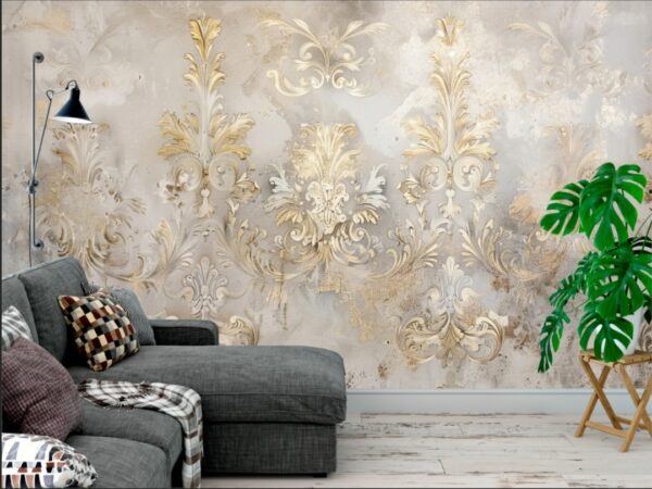 Baroque wallpaper featuring classical architectural designs in muted tones with gold details refined