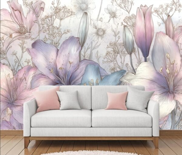 Elegant lily and wildflower background in pastel purple and pink tones. Dreamy watercolor pattern. Immerse yourself in timeless beauty with the delicate Floral Toile De Jouy Seamless Pattern.