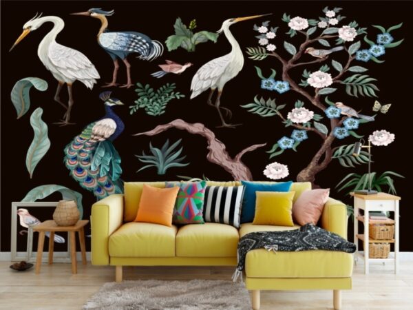 Herons, peacock, peonies and bird in chinoiserie style isolated. Vector.