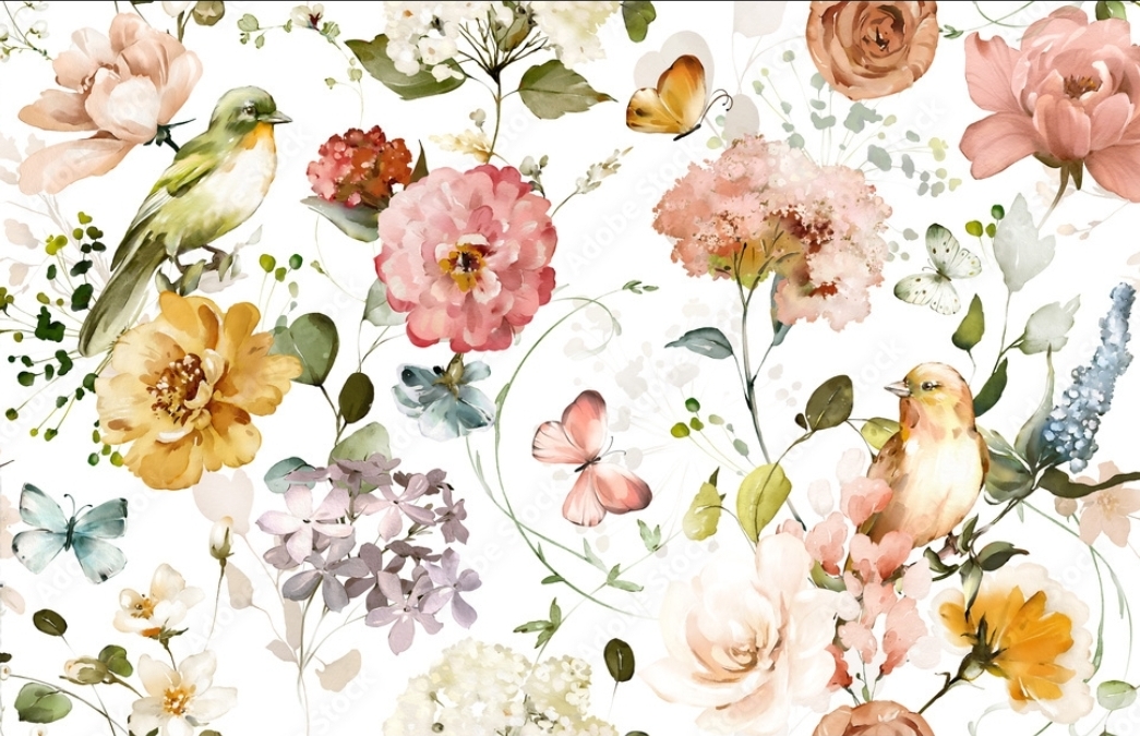 seamless floral watercolor pattern with garden pink flowers roses, leaves, birds, butterfly, branches. Botanic tile, background. AD 496317279