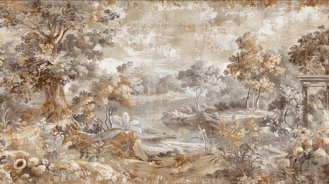 Tapestry-style Baroque wallpaper with pastoral life scenes in rich earth tones and gold accents for a rustic timeless look
