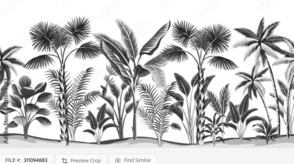 Tropical vintage botanical landscape, palm tree, banana tree floral seamless pattern white background. Exotic black and white jungle wallpaper. By good_mood