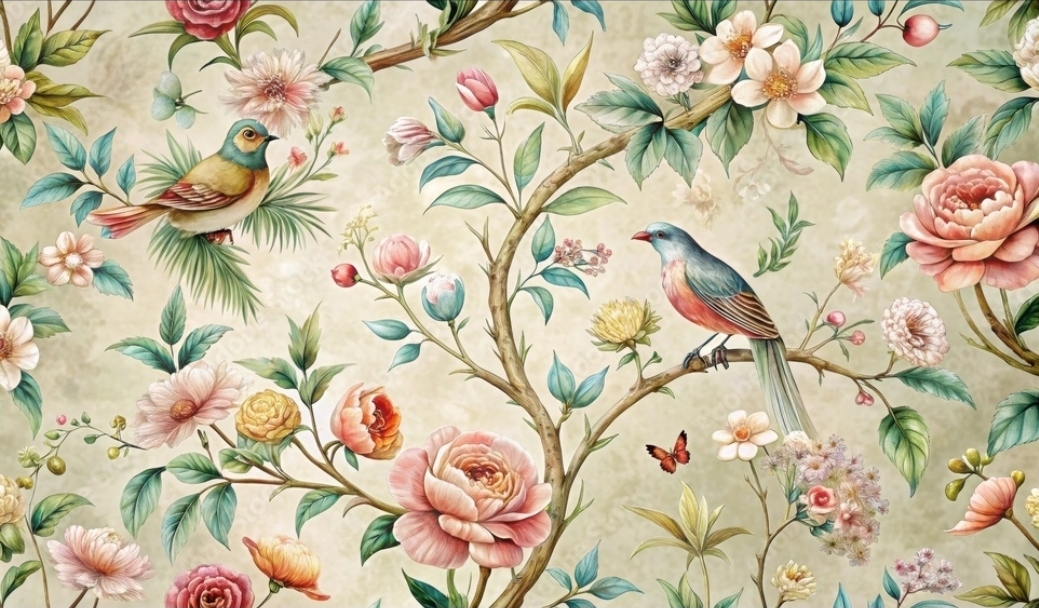 Vintage floral Chinoiserie pattern with spring flowers and birds in muted colors, Bloom, Vintage, Floral, Chinoiserie, Pattern