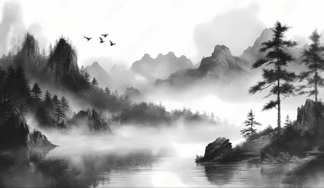 Vintage landscape drawing of lake with birds, trees, and fog in black and white 1130966578